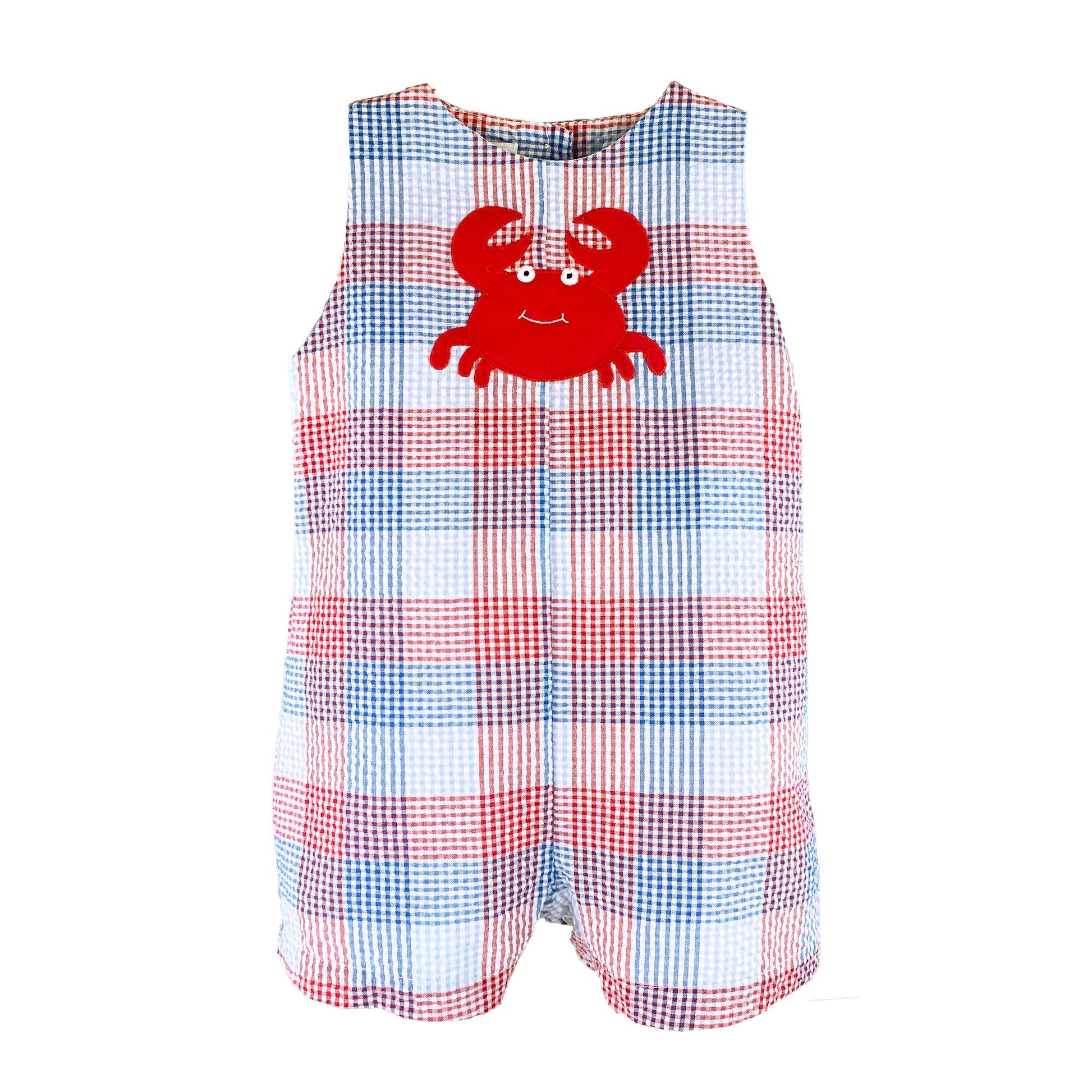 This outfit comes in a red, white and blue seersucker plaid fabric and features a friendly crab applique on the front. A perfect summer outfit that can also be worn for the 4th of July!