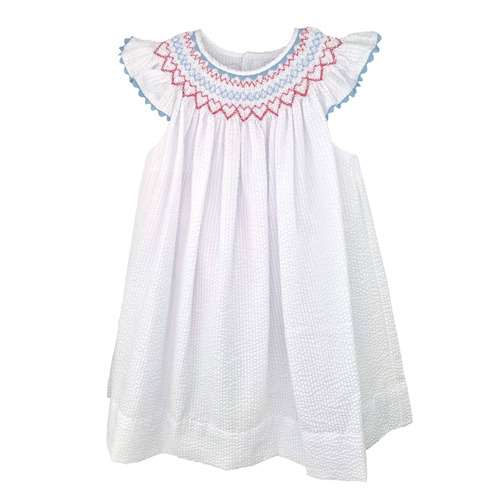 This simple dress comes in a white seersucker fabric with angel wing sleeves and patriotic red, white and blue bishop smocking. Perfect for hot summer days and summer celebrations!